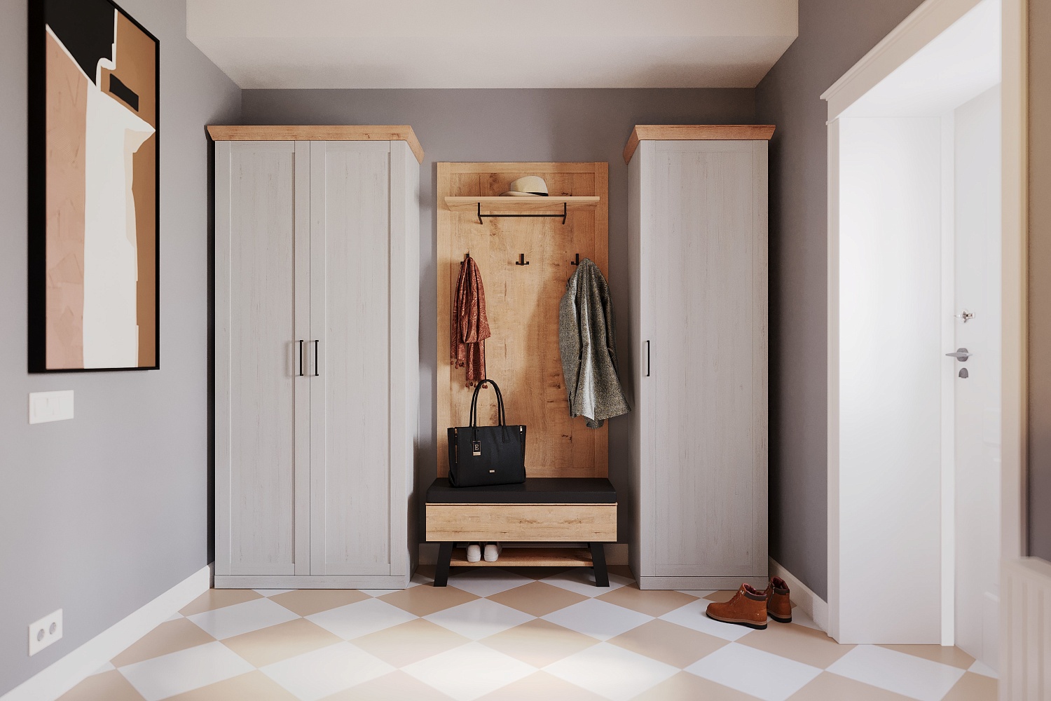 – описание: стиль современный, минимализм, назначение для прихожей, цвет дуб бунратти, блан шене.
